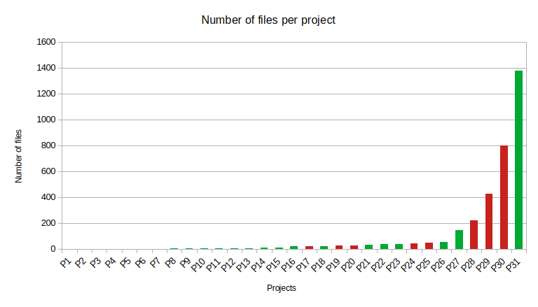 If you'd graph out the number of files per project folder, I think you'd get a pretty long tail, in the sense that there are a few projects with most files, and most projects having only a few. Actually, let's do that: