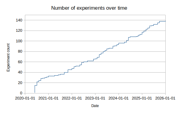 Currently there are 138 experiments, which is equivalent to starting a new experiment every 13 days or so since I started my PhD. That feels about right. Have a look at this nice plot: